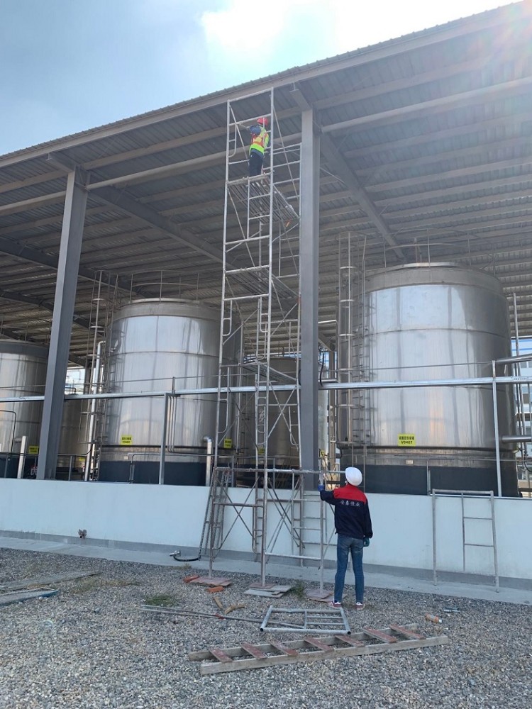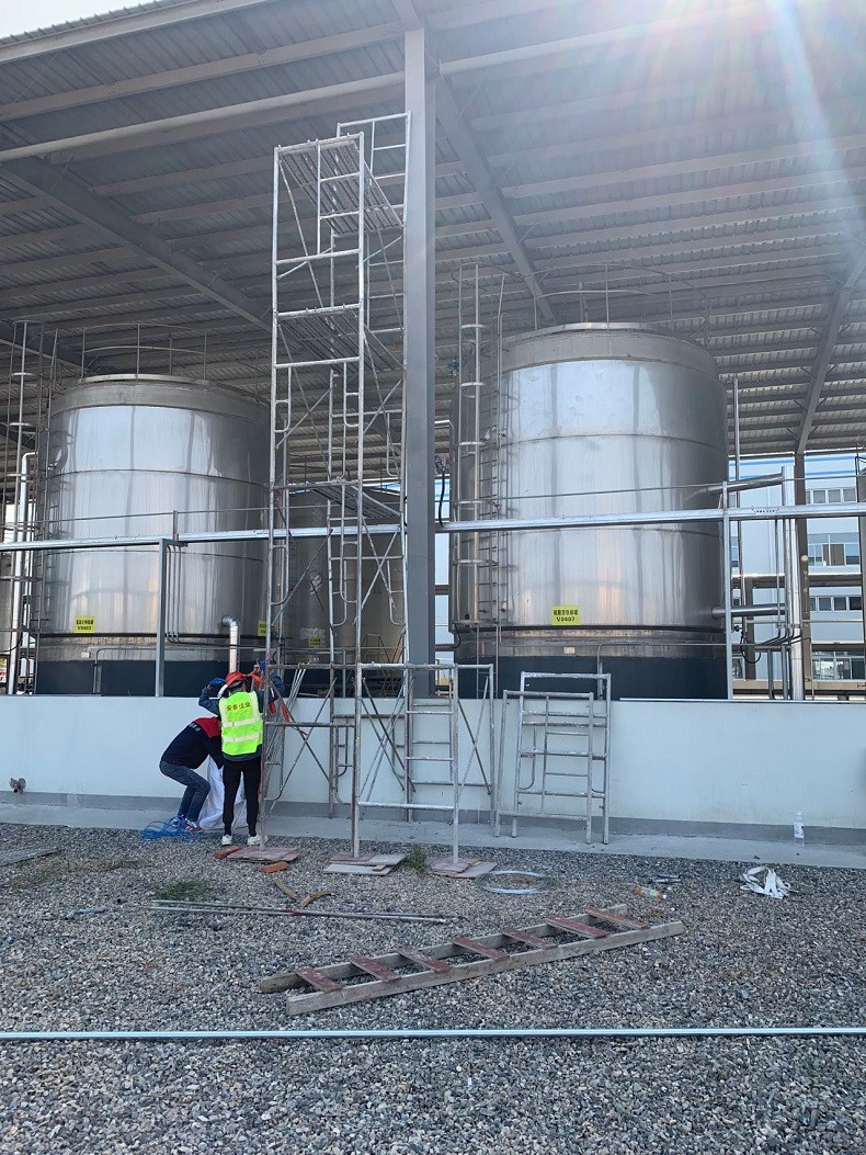 危化品罐区存放丁酯、硫酸等,客户要求在整个罐区无死角安装防爆视频监控系统。罐区高处12米高,要在高处安装防爆高清球机。在四周安装防爆枪式摄像机,因为罐区建成后无法进出大型登高设备,所以我方技术人员经过评估后采用搭建脚手架方式登高作业。登高作业人员进行施工前经过了严格的安全培训,必须式持证登高。在经过安全细致的施工后,圆满完成这次危化品罐区视频监控。
